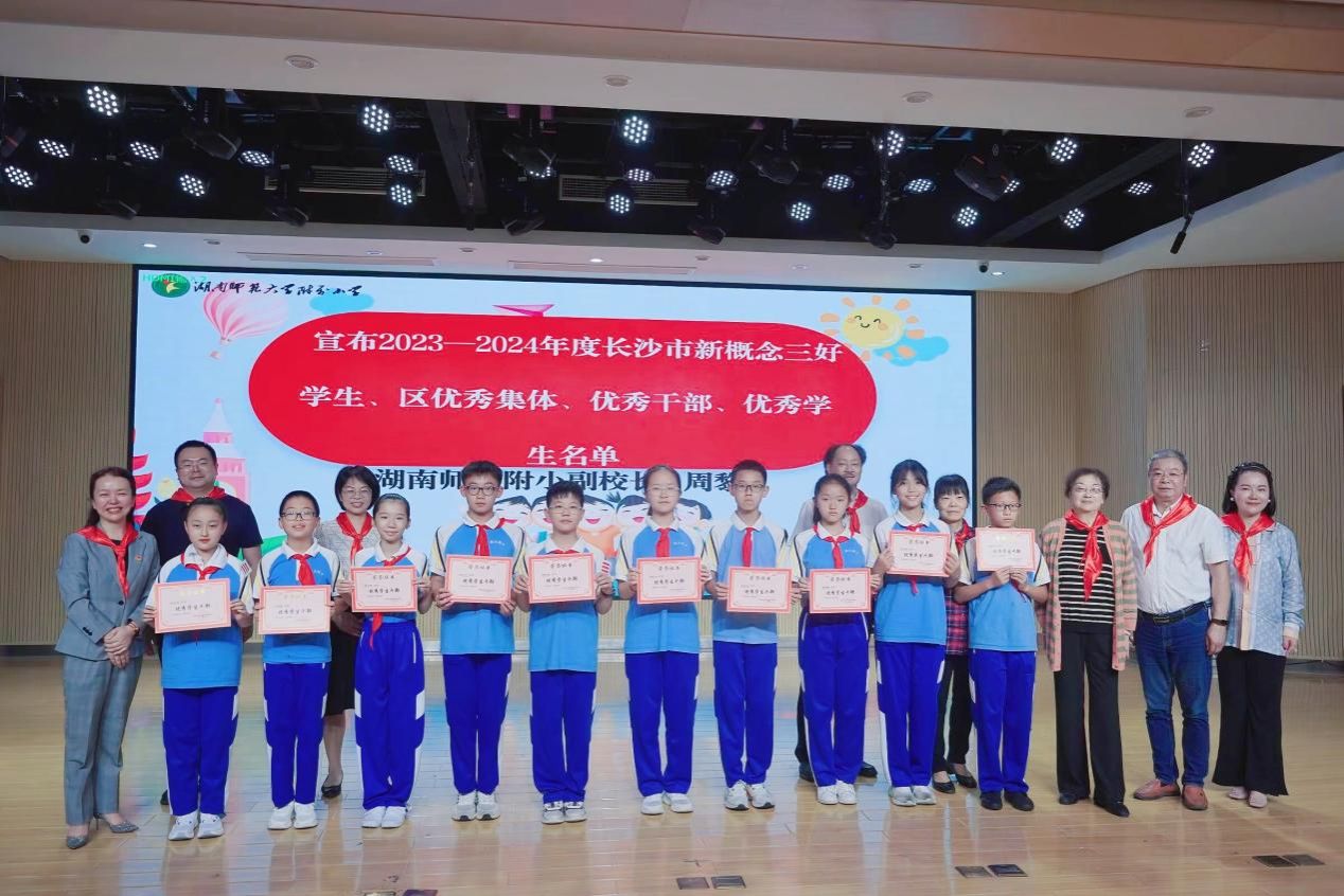 活动中,与会领导嘉宾一起为2023-2024学年度长沙市新概念三好学生、区级优秀集体、区优秀干部、区优秀学生、校级优秀集体、校五好学生颁发荣誉证书及奖品。