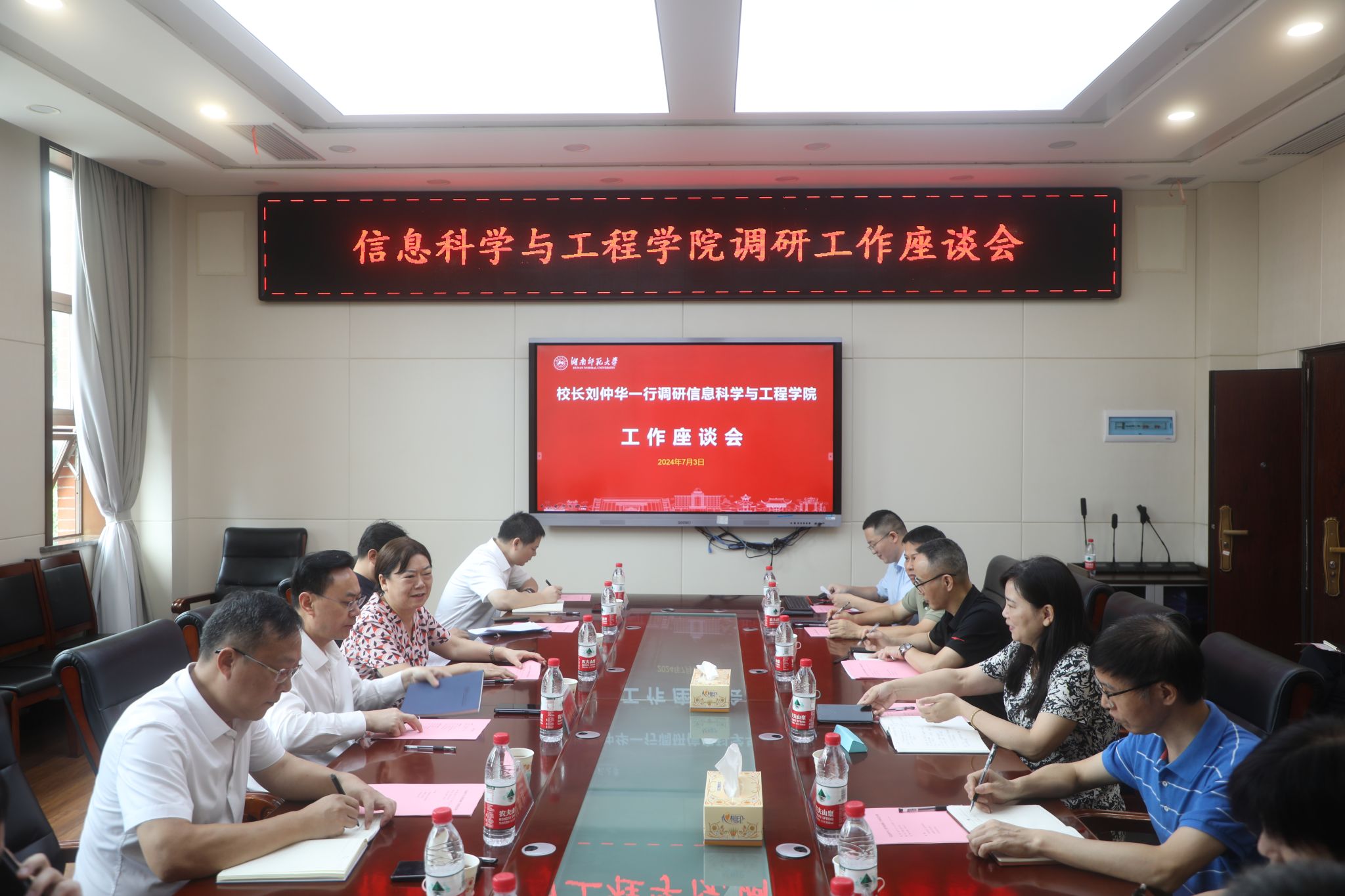 在信息科学与工程学院,刘仲华对学院智慧教育、多学科交叉融合发展等方面取得的成就表示肯定。他指出,创新型、技术型人才服务社会经济发展的需求量大,学院学科建设和发展恰逢其时、大有可为。他表示,我校长期以来坚持文理兼容、文理工协调发展,学院要及时找短板、补短板,依靠深厚的学科实力,加速创新转型升级,并对学院下一阶段工作开展提出几点要求:一是要不断优化师资结构,倾心引才、悉心育才、精心用才,培养一支具有潜力的创新型年轻化人才队伍;二是要主动拥抱数智新时代,促进教育信息化、智慧化建设,不断提升教育教学质量和管理水平;三是要整合校内外资源,培育“大项目”,持续产出具有影响力的大成果、大项目,提升我校科技创新成果的显示度;四是要以产教融合赋能学院发展,推动科研成果转化和产业应用,为湖南省社会经济发展贡献师大智慧和师大力量。