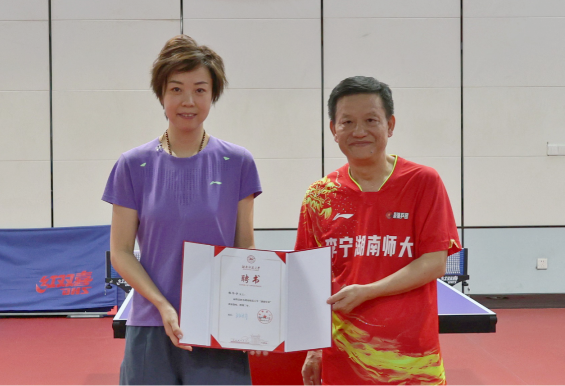 蒋洪新为张怡宁颁发“潇湘学者”讲座教授聘书。