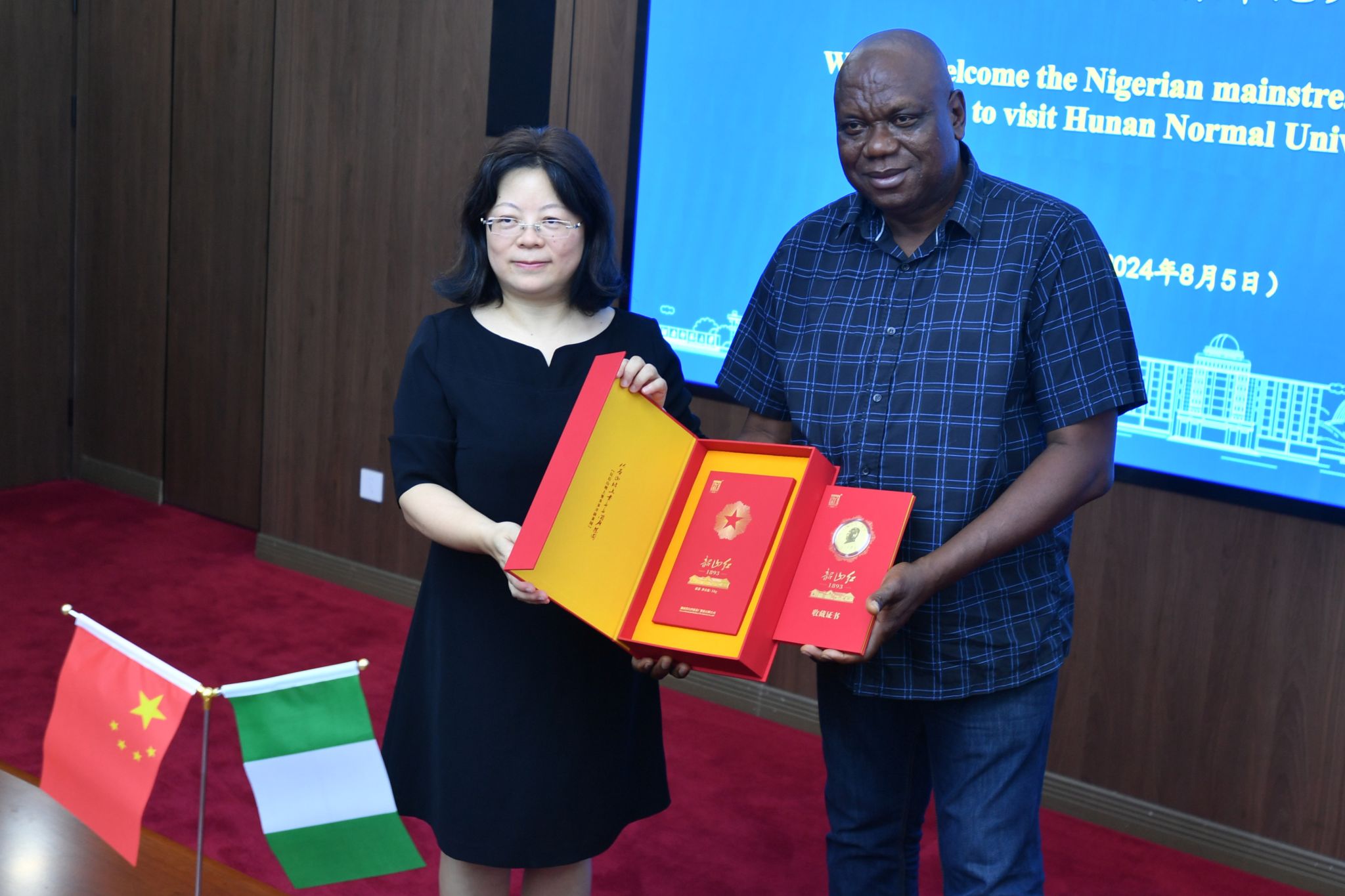 徐姝代表湖南城市学院全体师生向各位非洲朋友表示诚挚的问候和衷心的感谢。她简要介绍了湖南城市学院与非洲的合作成果,并表示,湖南城市学院办学五十多年来,始终胸怀“国之大者”,高度重视国际交流与合作,多年来与非洲双向奔赴,取得了多方面合作交流的成果。特别与非洲加纳海岸角大学合作举办“孔子学院”,搭建了中非文化交流、友好交往的桥梁,建立了良好的合作关系。她表示,尼日利亚是湖南对非合作的重点国家,城市学院将继续努力推动中非合作,加强留学生培养,加强与尼日利亚新闻媒体的交流合作,积极探索、共享高校办学发展的经验智慧,在更宽广的领域里开展更深层次的合作,让合作成为交流思想、辨析问题、探讨学术、增进友谊的重要平台。