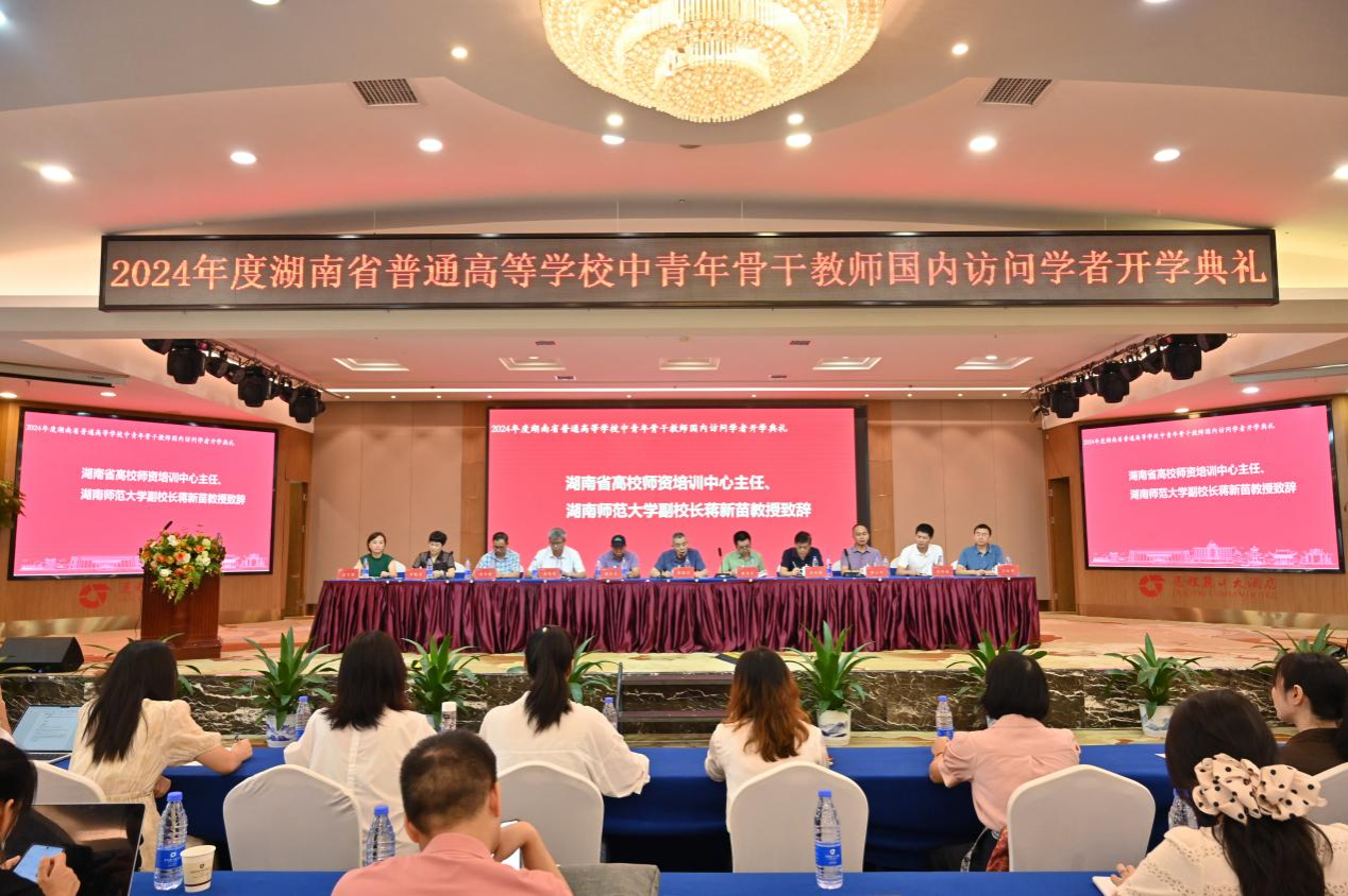 (供稿 高师培训中心)9月11日下午,2024年度湖南省普通高等学校中青年骨干教师国内访问学者开学典礼在长沙举行。我校副校长、省高等学校师资培训中心主任蒋新苗出席典礼。开学典礼由省高等学校师资培训中心常务副主任罗晓慧主持。