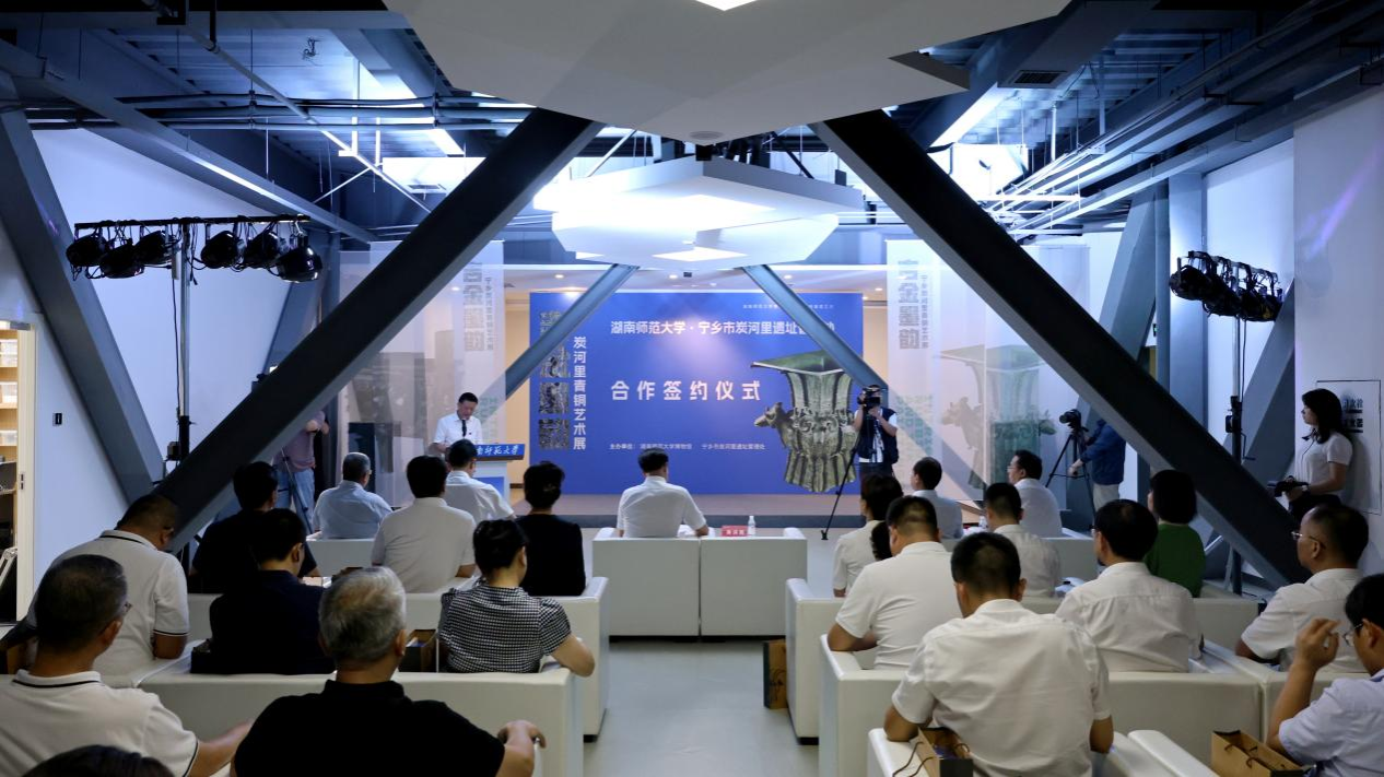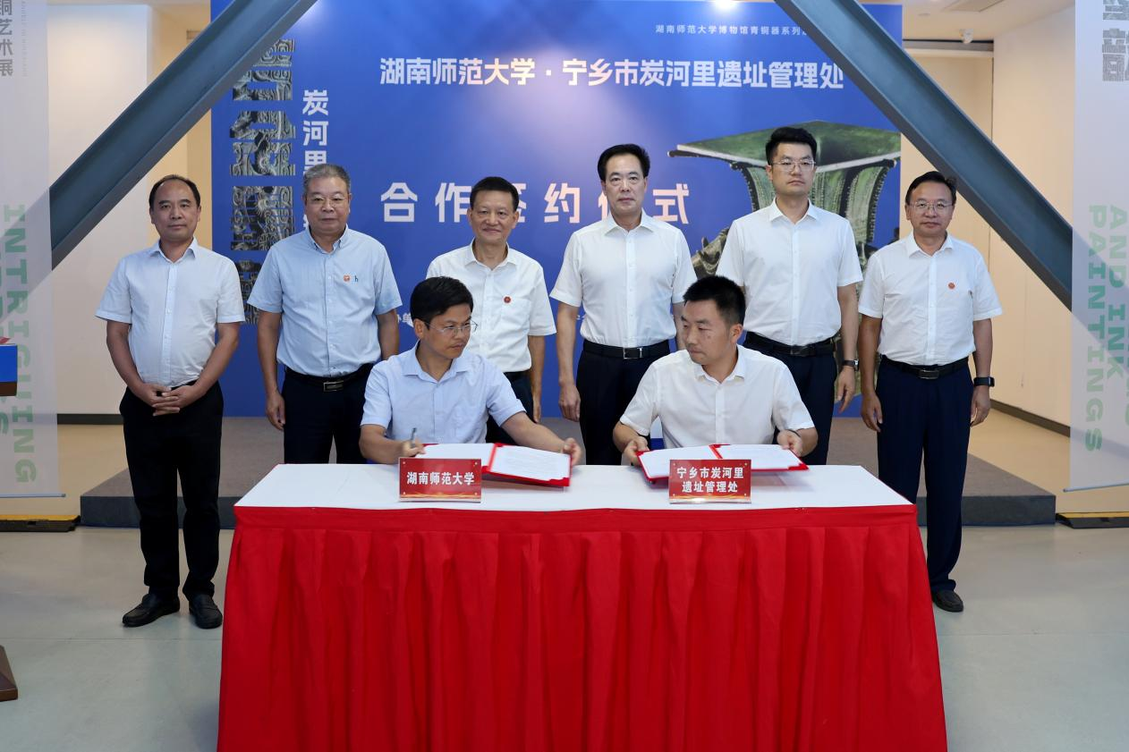在张作林、蒋洪新等嘉宾的见证下,我校历史文化学院院长、校博物馆馆长刘利民与宁乡市炭河里遗址管理处主任张亚光代表双方签订了合作协议。