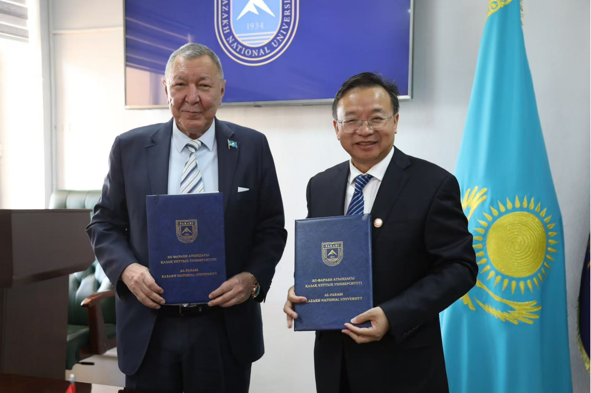 在哈萨克国立大学访问期间,第一副校长叶尔肯·杜伊谢诺夫(Yerkin Duissenov)、国际处处长奥米尔扎诺夫·叶斯波力、孔子学院院长阿谢力别克夫·阿克木江、学院及相关部门负责人热情接待代表团一行。双方亲切交流并签订合作协议。哈萨克国立大学系我校首个在哈萨克斯坦合作院校,刘怀德表示,希望两校共同搭乘“一带一路”快车,携手共进。代表团参访了哈萨克国立大学校史馆、图书馆、教学楼及地理科学实验室等。