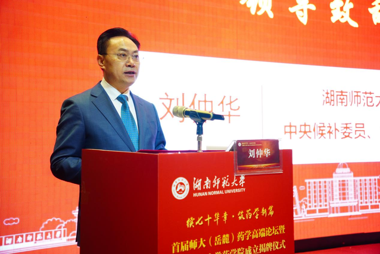 (供稿 医学部)12月1日上午,我校药学院成立揭牌仪式暨首届师大(岳麓)药学论坛举行。湖南省药品监督管理局党组成员、副局长姚咏梅,湖南省药学会理事长李焕德,中国工程院院士、校长刘仲华出席仪式。揭牌仪式由医学部党工委副书记鄢朝晖主持。
