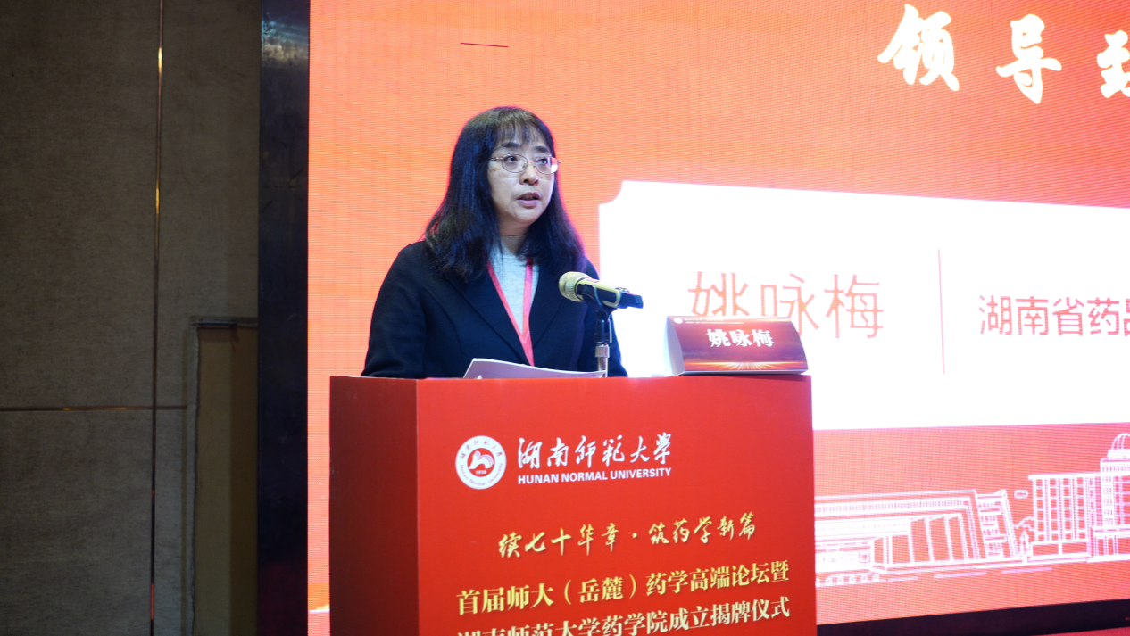 姚咏梅代表湖南省药监局衷心祝贺药学院的成立。她回顾了我校药学教育办学70年以来取得的丰硕成果,并表示,药学院的成立是对湖南省医药卫生事业的一次重要推动。她表示,学院发展要始终坚持“以人为本、立德树人”的根本原则、发扬“仁爱精勤”的校训精神与“勤诚谨毅”的医教传统,立足湖南,面向全国,将药学专业打造成中南地区领先、国内一流的专业。