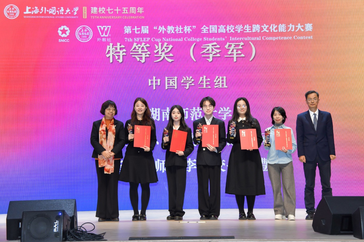 (供稿 外国语学院)11月28日至12月1日,第七届“外教社杯”全国高校学生跨文化能力大赛决赛、总决赛在上海外国语大学举办。在中国学生全国总决赛中,由李澧、李文佼指导的我校代表队邱立强、廖茂邱、谢思雨三位同学荣获全国特等奖,并在单项奖的角逐中获得最佳合作奖。