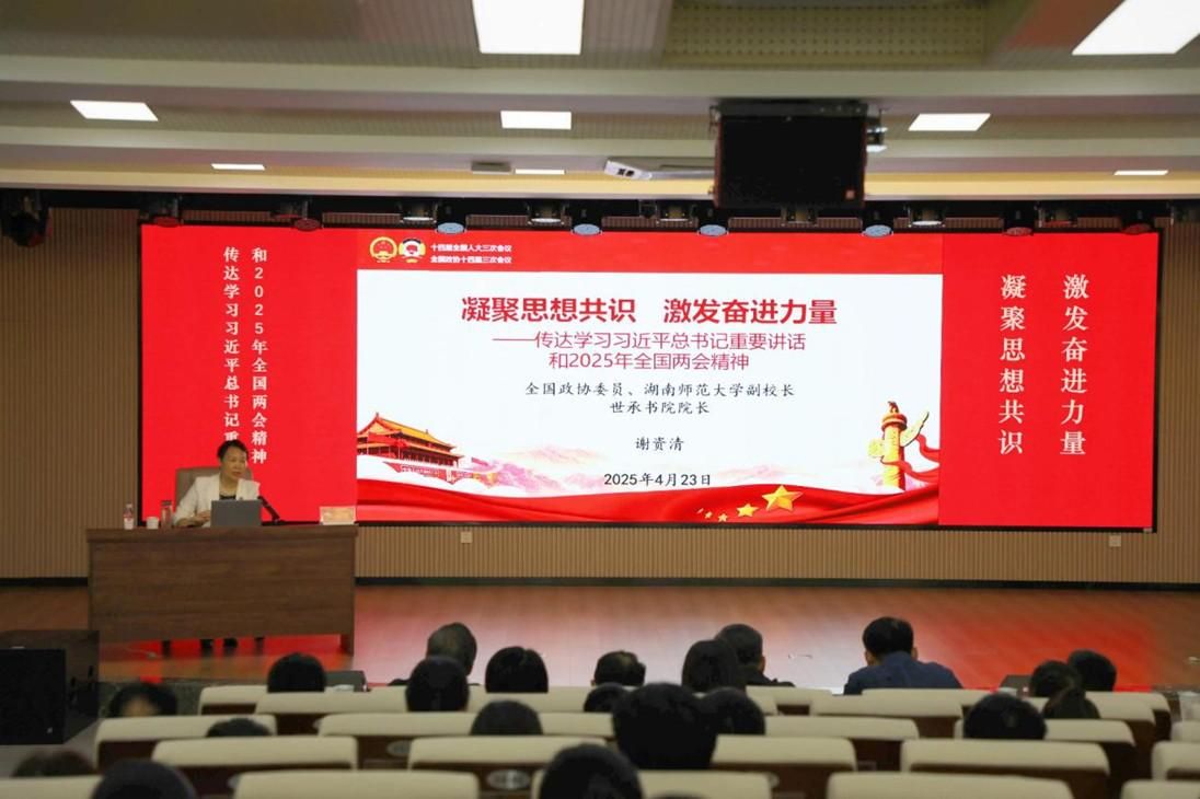 谢资清走进世承书院,以“人勤春来早,奋斗正当时”为题,为师生们带来了一场内容丰富的“两会”精神解读会。她全方位介绍了2025年全国两会的基本情况、政府工作报告主要精神和住湘全国政协委员履职情况。其中,重点传达了习近平总书记在民盟、民进、教育界联组会上的重要讲话精神,为师生们的学习和工作指明了方向。
