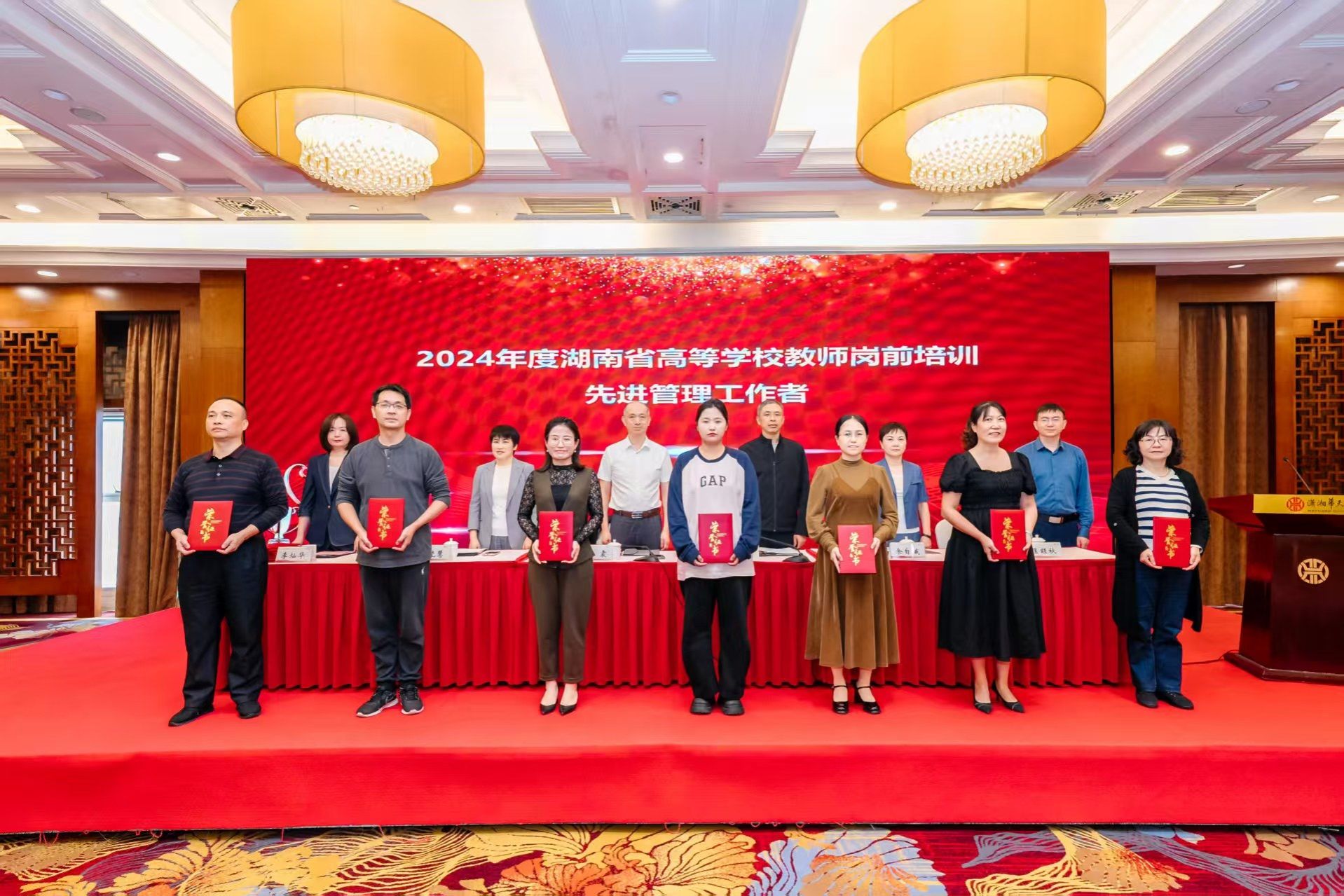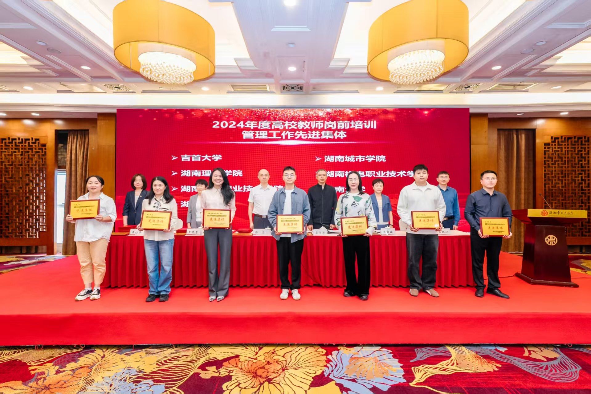 杨震宣读《安博线上平台表彰2024年度湖南省高等学校教师岗前培训先进集体、先进管理工作者和优秀学员的决定》,并与主席台就座的领导为获奖集体与个人颁奖。