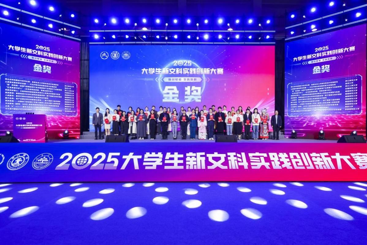 该赛事由教育部高等教育司指导,全国新文科教育研究中心主办,西安交通大学、山东大学承办。赛事坚持融创赋能、实践致新,鼓励学生打破学科专业壁垒,引导人才培养创新发展。本届大赛历时四个月,经过初赛和决赛网评赛,来自29个省(自治区、直辖市)、221所高校的454个项目晋级决赛现场赛进行展示和答辩。我校文学院参赛团队凭借扎实的研究基础、创新的项目设计和出色的现场表现,最终斩获金奖,展现了学校在新文科建设与实践创新人才培养方面的成效。