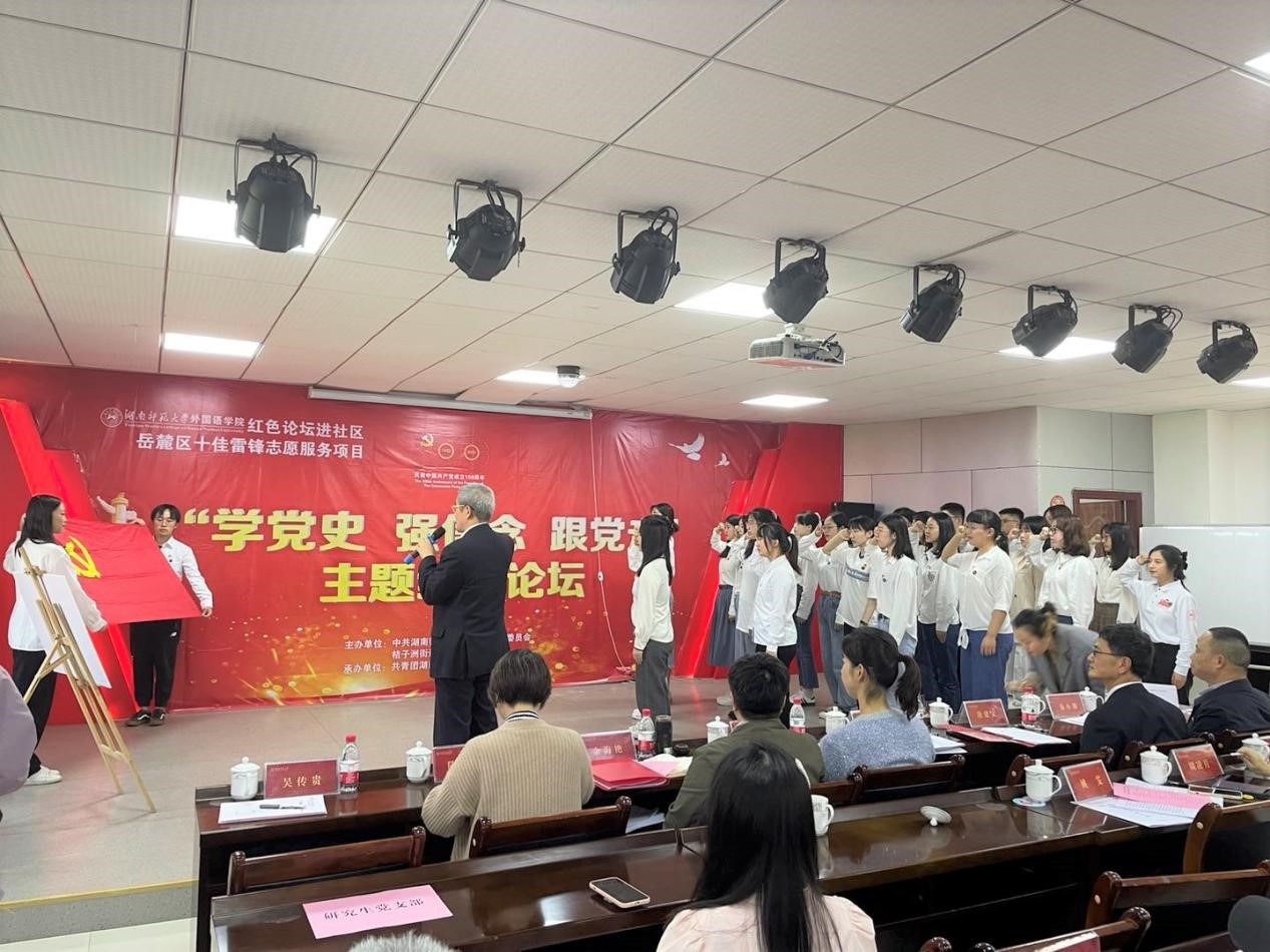 桔子洲街道党工委组织委员、学堂坡社区党总支第一书记王菁,安博线上平台外国语学院党委副书记贺慧星,学堂坡社区党员代表,学院研究生、本科生党员,团校“青马工程”学员等150余人参加论坛。