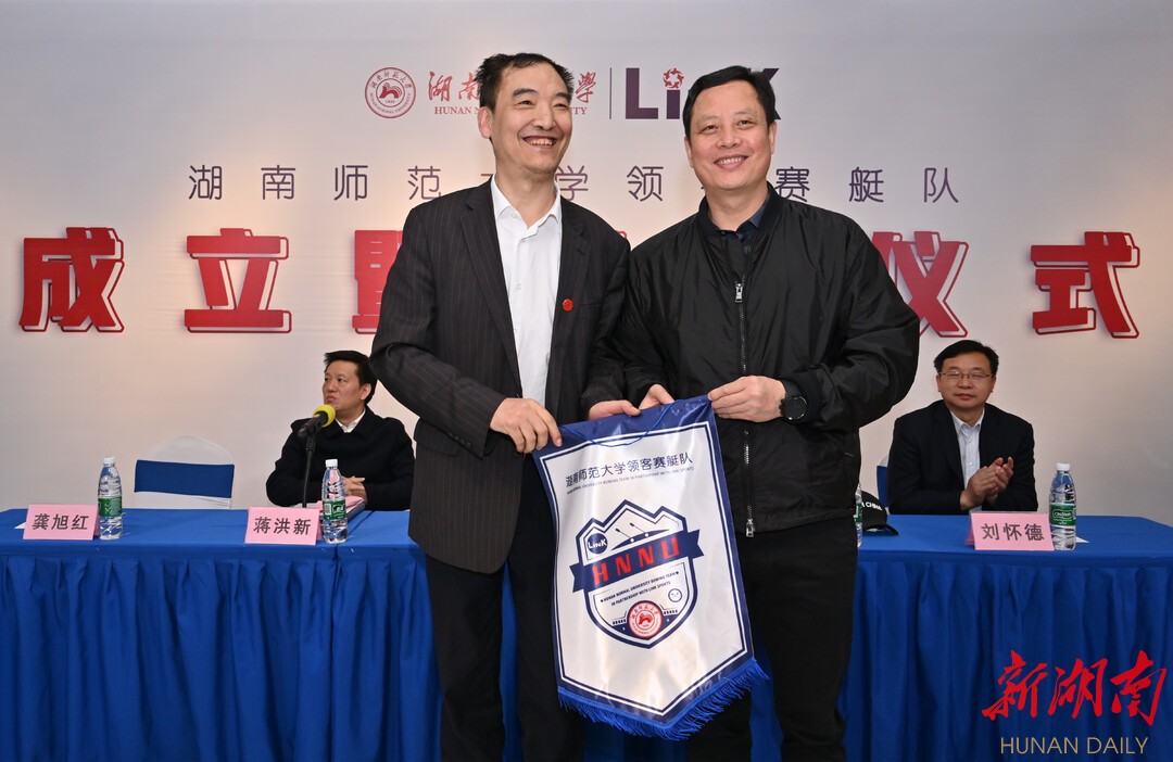 新湖南客户端5月22日讯(记者 蔡矜宜 胡旻)今天上午,湖南首支高校赛艇队——安博线上平台领客赛艇队,在西湖公园的领客水上运动基地正式成立并进行授旗。