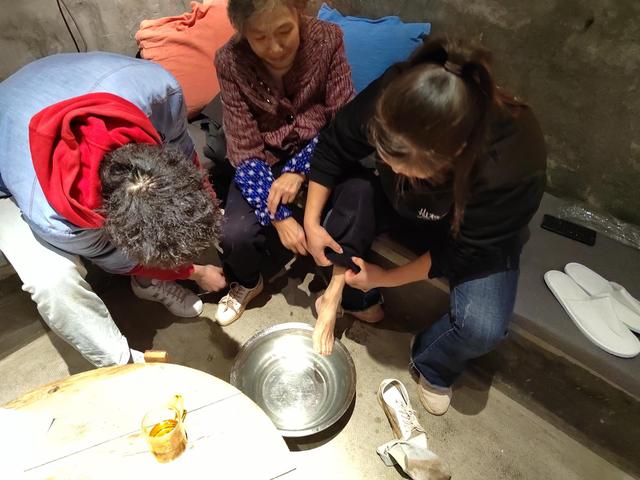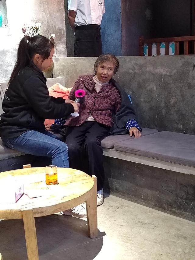 谢冬梅和店员把老奶奶带回店里,给她吹干了头发和外套,还给她打来一盆热水泡泡脚,把袜子吹干,还给她找了一双鞋换上。老奶奶说自己叫黄庆英,家里住在百子塘,因为家里没水,所以出来打水,早上9点多出门的,但是半道上迷路了,一直走走走,就走到了这里。走了一整天,也没吃午饭,老人家又冷又饿,所以店员还给她做了两个菜,盛了热米饭让老人家吃。