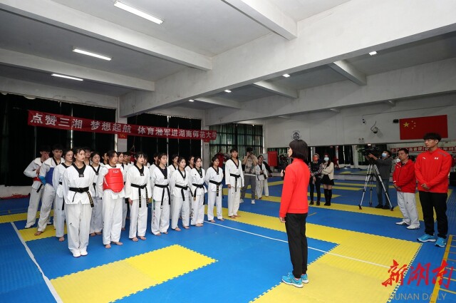 在该院跆拳道馆,全国冠军向若鸣和彭姗在该校跆拳道队现场展示后,与队员们分享了自己的训练经验以及比赛经验,并对他们的现场表现进行了简单指导。