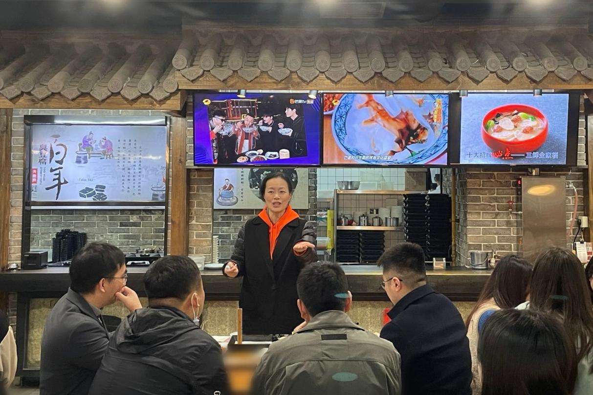 在位于长沙市坡子街的火宫殿总店,火宫殿总经理周后长等带领学生们参观了古牌楼、古戏台、金砖照壁、臭豆腐非遗馆、湘菜首府等地,较为全面地介绍了火宫殿的历史沿革及其所富含的宗教、民俗、饮食、消防等文化底蕴;陈天嵩老师讲解了火宫殿八大小吃的历史典故与制作技艺,重点对小吃所承载的湖湘文化内涵进行了阐释;郑燕虹教授、叶冬老师以中华美食翻译为例,分析了美食等非遗文化在新时代国际传播中的重要价值与意义,讲解了增译、减译、归化、异化等翻译策略的具体运用场景,引导学生要铭记历史、传承文化、心怀天下、开拓创新。