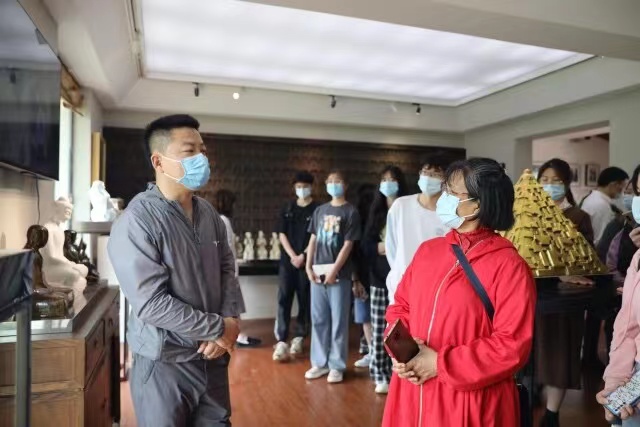 在后湖国际艺术园,授课教师陈天嵩、阜山窑陶瓷艺术馆策展人董维带领学生参观了“无有界——李亮东阜山窑陶瓷艺术作品展”。阜山窑按照古代官窑的形式与当地山形地貌和谐结合而创建,秉承和复兴了濒临失传的古老的柴窑烧制技术,从原料的选择,加工,配置到成型,施釉,烧成,每一件作品都经历了数十道严谨精细的工序。一尊尊还原古法制瓷工艺、融入时代元素的精美瓷器,引发了学生们对古代官窑烧制技艺与东方佛造像等艺术形式在陶瓷等器物层面呈现、应用的思考。期间,学生们结合自身申报、参与研究的“湖湘文化人物IP盲盒设计与开发”“湖湘民俗文化主题剧本杀”等双创项目与授课教师进行了深入交流与探讨。