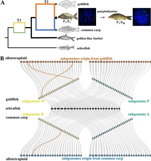 鱼类有32000多种,是脊椎动物中物种数目最多类群。鲤科为淡水鱼类最大的一科,约有200多属2000多种,多倍化事件对于鲤科鱼类的物种分化和环境适应具有重要意义,已有研究揭示鲤亚科鲫和鲤以及鲃亚科金线鲃共同起源于13.8~15.1百万年前的一次异源四倍化事件。