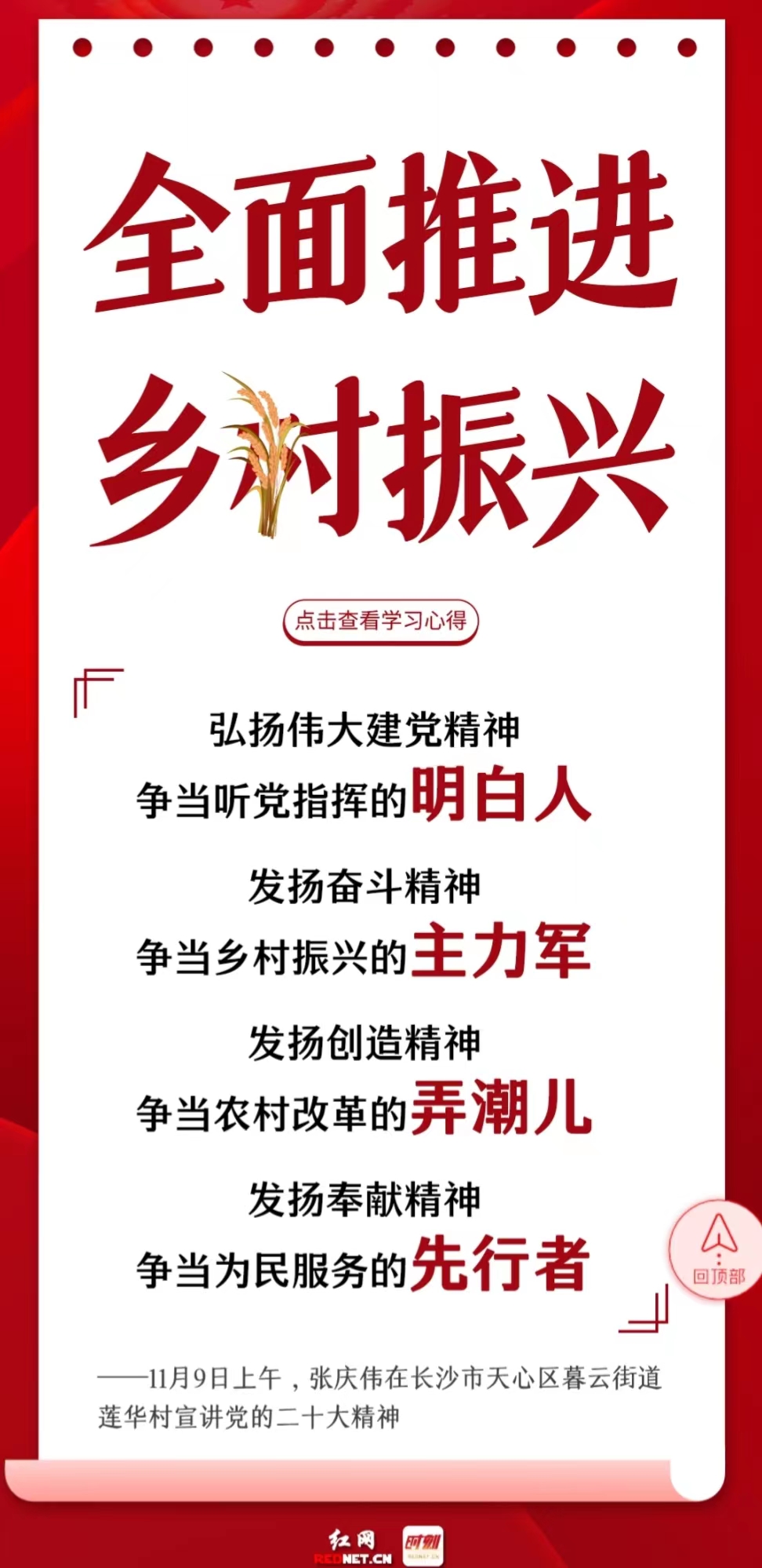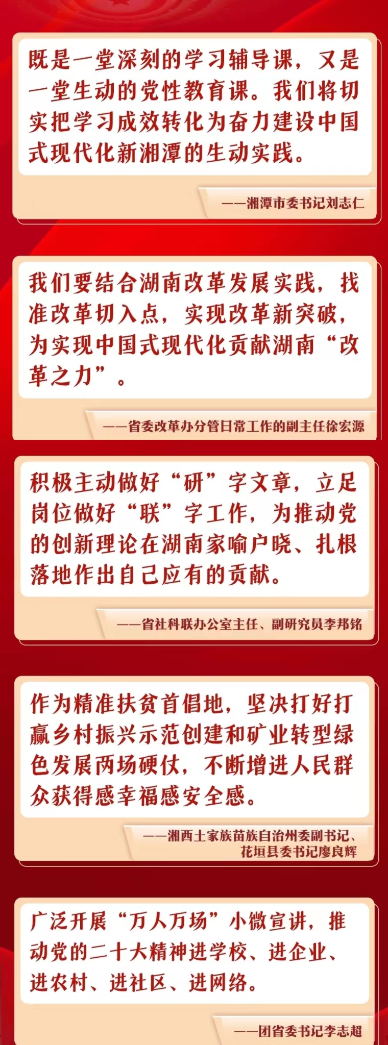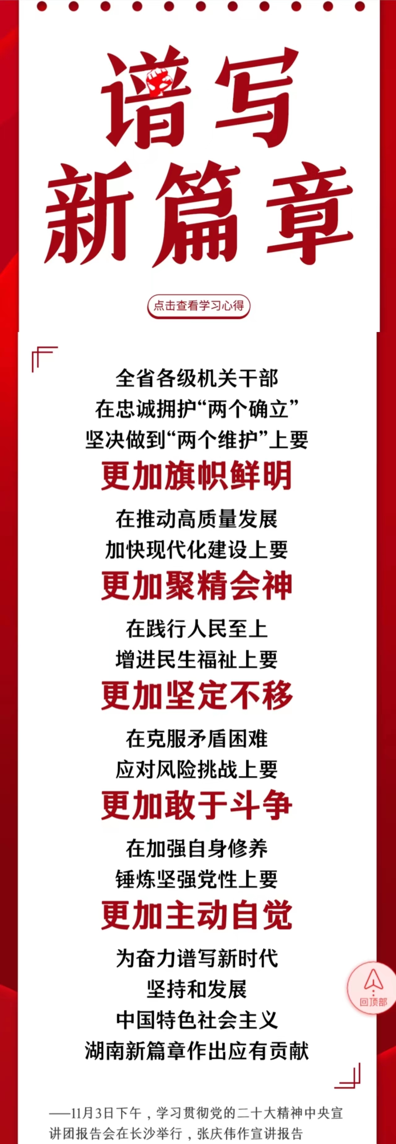 11月3日-9日,中央宣讲团成员、湖南省委书记、省人大常委会主任张庆伟开展五场宣讲活动,宣讲党的二十大精神。一场面向全省党员干部,四场面向高校、企业、社区和乡村。二十大精神怎么学?省委书记为你划重点。下一步怎么干?来看看大家的学习心得。