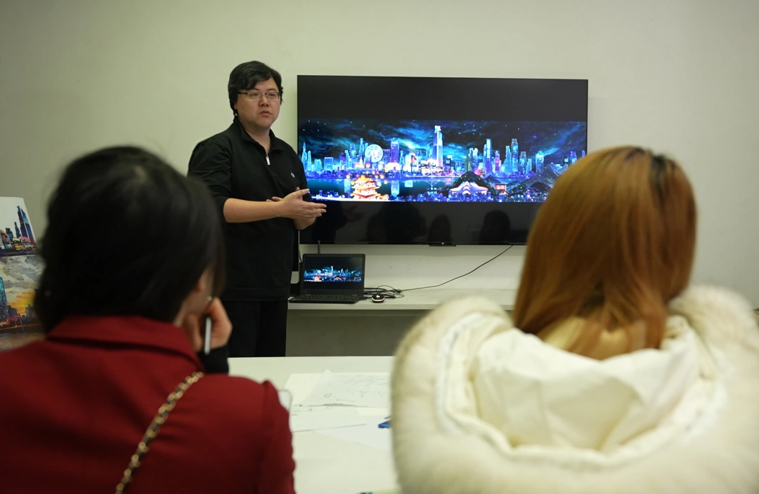 “声音都是我们设计团队去现场实景录制的。”《手可触星城》创作团队来自安博线上平台美术学院的数字媒体艺术交互设计工作室。黄龙是这幅作品的总策划与主创,成员包括他的研究生设计团队以及技术支持tt(张卓)。
