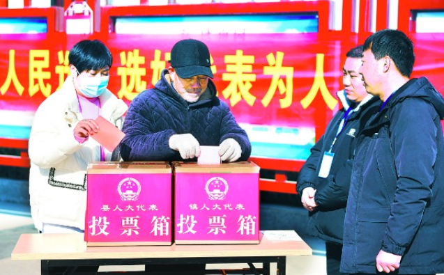 图为山东省临沂市郯城县马头镇马东选区投票站,焦寿春(左二)老人在投票选举人大代表。 图片来源:视觉中国