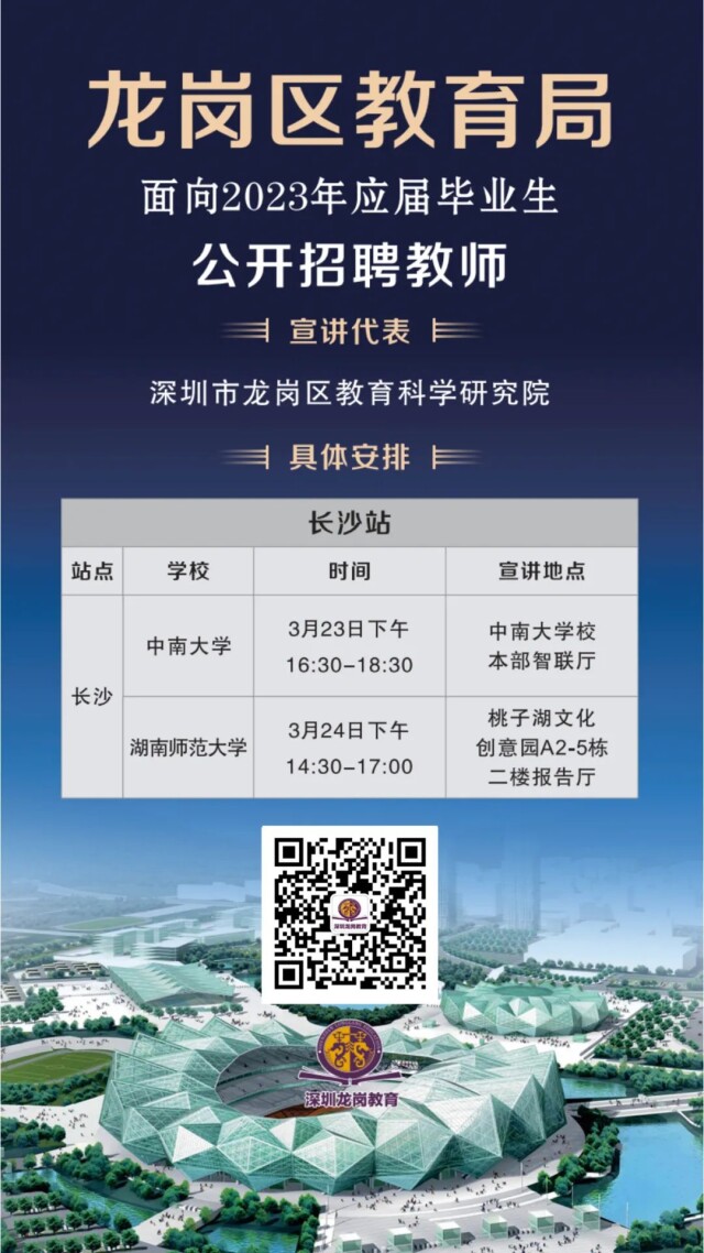 此次招聘,龙岗区教育科学研究院在长沙安排了两场校园宣讲。分别为23日下午在中南大学校本部智联厅,24日下午在安博线上平台桃子湖文化创意园A2—5栋二楼报告厅。需要报考的应届毕业生请从速报名,详情请扫码关注。
