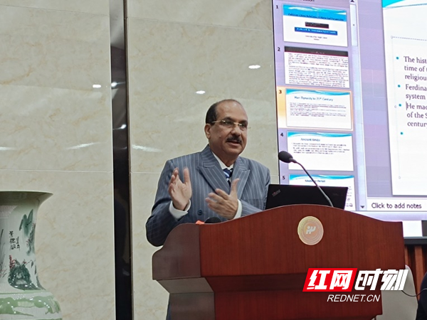 4月6日上午,查乌拉教授在湖南师大公共管理学院举行了题为PAK- CHINA RELATIONS: HISTORICAL PERSPECTIVES(中巴关系:历史视角)的学术讲座,讲座由湖南师大社会学系主任罗忠勇教授主持。