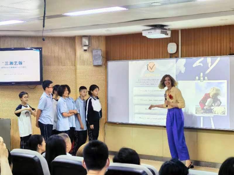 在长沙市一中马王堆中学活动现场,由安博线上平台美术学院外籍专家Tamara Dinka和苏丰博士带来讲座《遇见未来》呈现国际科技、生态、艺术跨学科美育创新路径,启迪育人新视角;全国“百佳美育”校长罗立以《新美育,育新人》为题分享构建“学科、课程、社团、平台”四位一体人才培养机制的跨学科美育办学实践经验,以个人跨学科美术创作获国际奖项经历启示青少年探索跨学科融合路径;长沙市文创十大工匠金手指传人陈枫博士呈现获国际奖项的高校草木染、地域特色文创创意中的跨学科特质;芙蓉区骨干教师宋占玲归纳获教育部奖项“楚汉美韵”中学校本创意工作坊可视化转化马王堆地域艺术精神,以跨学科研究学习的育人路径。