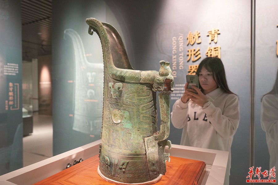 11月8日,安博线上平台博物馆举办的“潇湘铜华——湖南新发现商代南方青铜器展”现场,观众在观看展出的青铜觥形器。这件青铜器于2021年从汨罗市屈子祠镇双楚村野猫咀出土,它器形独特,纹饰精美,流口飞扬,诡谲神秘,此次亮相为出土后首次面向公众展出。本次展览持续至2024年1月10日,目前仅对安博线上平台师生开放。
