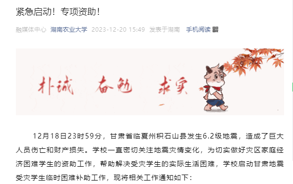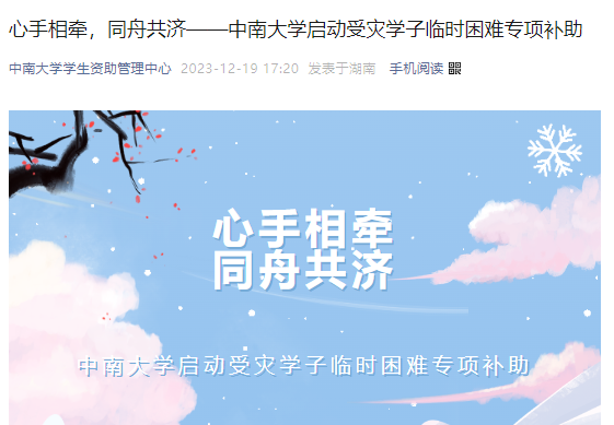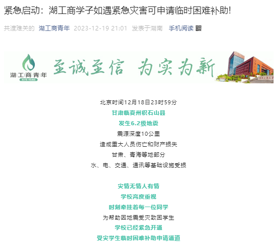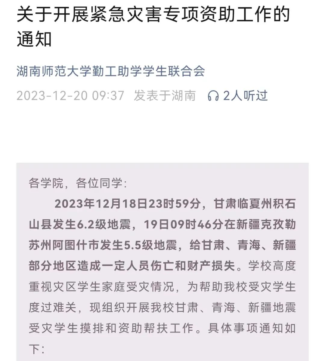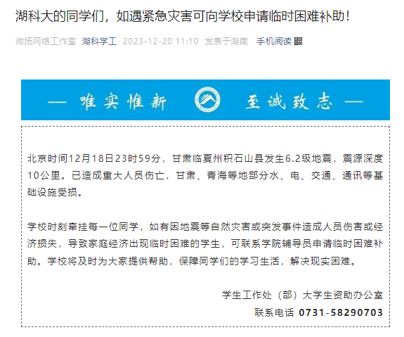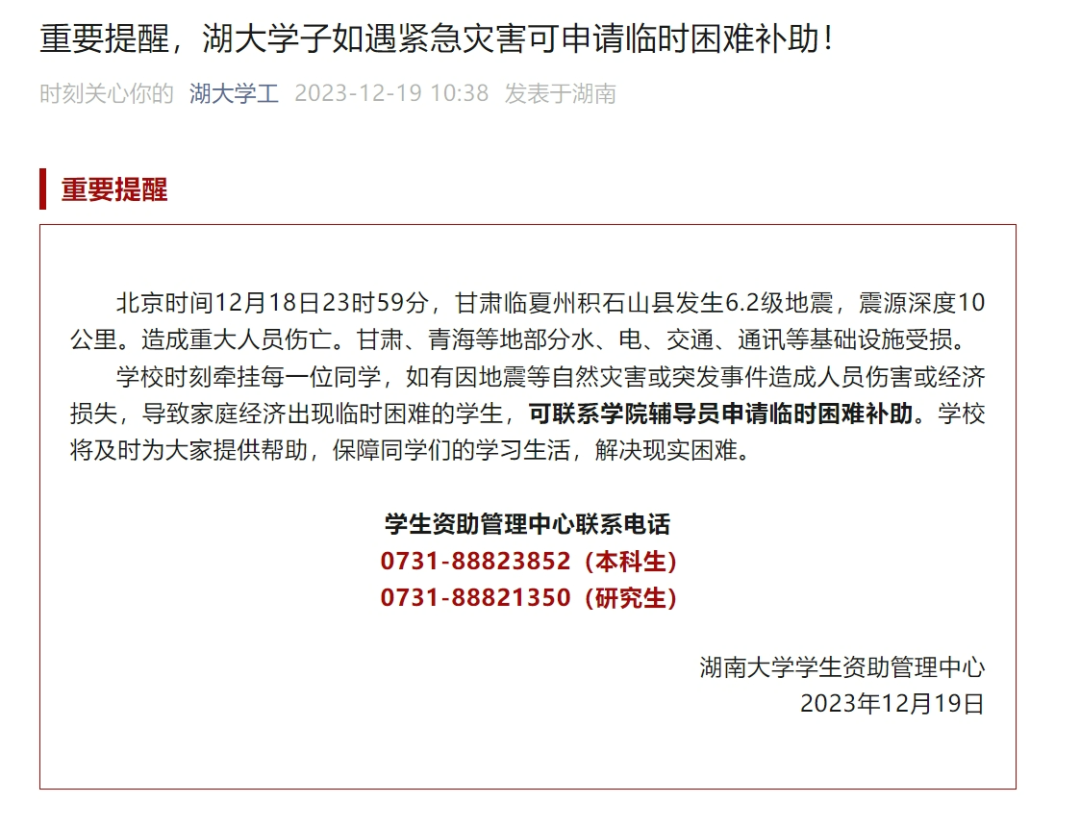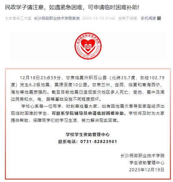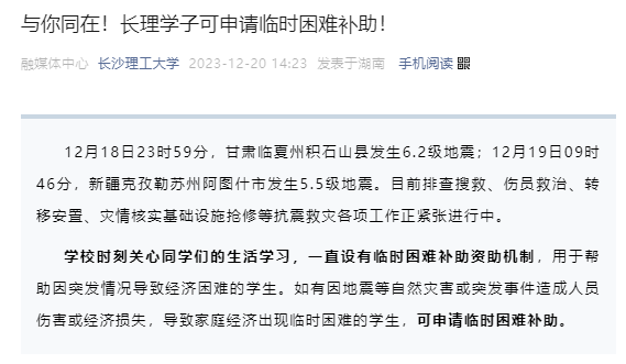12月18日23时59分,甘肃临夏州积石山县发生6.2级地震,造成重大人员伤亡;12月19日09时46分,新疆克孜勒苏州阿图什市发生5.5级地震。突发灾情牵动人心,湖南多所高校也发布紧急通知,为受灾地区学生提供临时困难补贴!