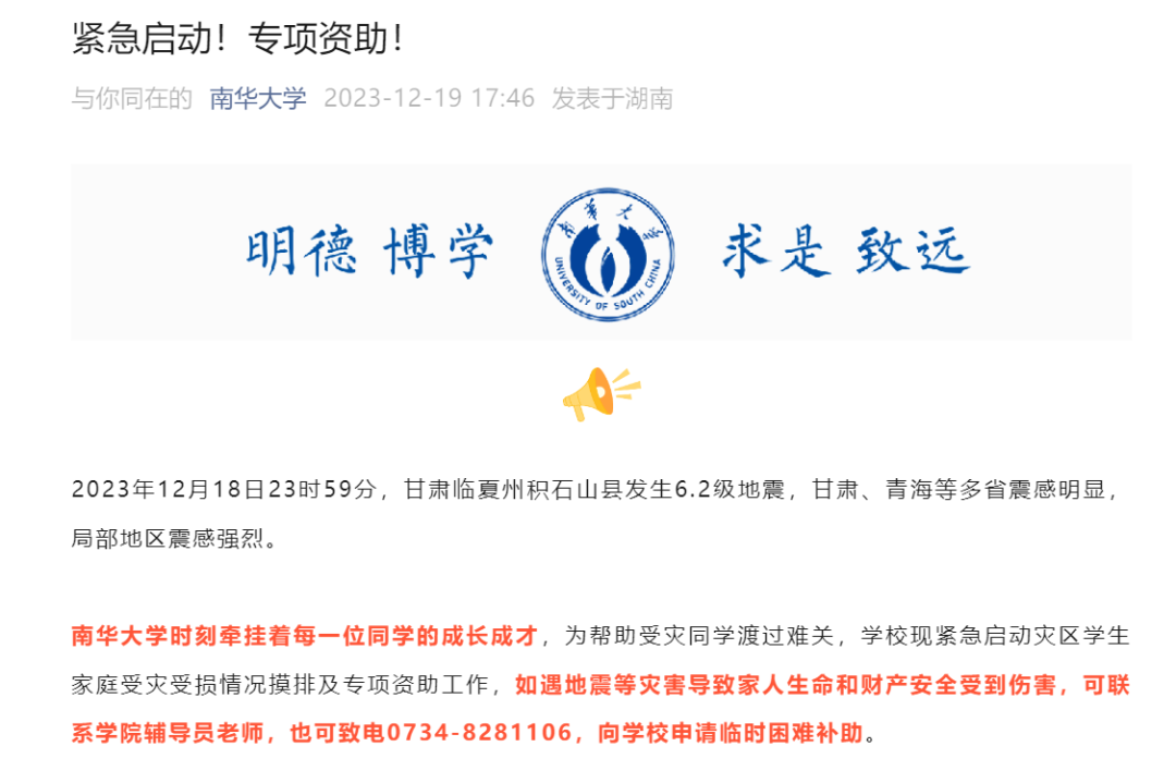 南华大学时刻牵挂着每一位同学的成长成才,为帮助受灾同学渡过难关,学校现紧急启动灾区学生家庭受灾受损情况摸排及专项资助工作,如遇地震等灾害导致家人生命和财产安全受到伤害,可联系学院辅导员老师,也可致电0734-8281106,向学校申请临时困难补助。