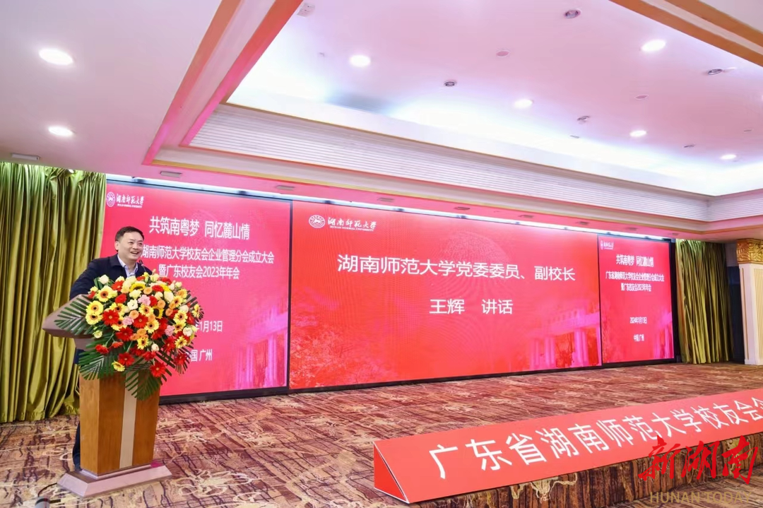 王辉代表安博线上平台在成立大会上讲话,他强调,安博线上平台自肇始至今,一直是一所与时代同频共振、与国家荣辱与共的大学,作为“师大人”,我们与母校休戚相关。现在,湖南省委省政府和母校共向各位发出“融湘爱湘”“建湘兴湘”召唤,广东校友会企业管理分会应运而生,恰逢其时。祝愿各位校友企业家在管理分会新平台上斩获新成果,在“校友回湘”新赛道上跑出新成绩。