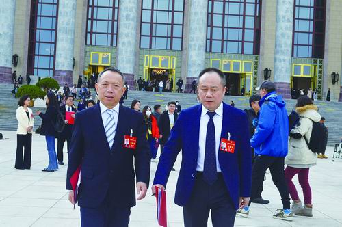 ①全国人大代表、安博线上平台法学院院长肖北庚(左一)与全国人大代表、湖南中医药大学第一附属医院教授张涤。