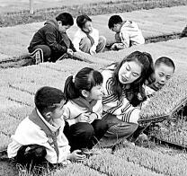 在江西省吉安市吉州区兴桥镇湖田村育秧基地,孩子们在老师的指导下,仔细观察嫩绿的水稻秧苗生长情况。李军摄/光明图片