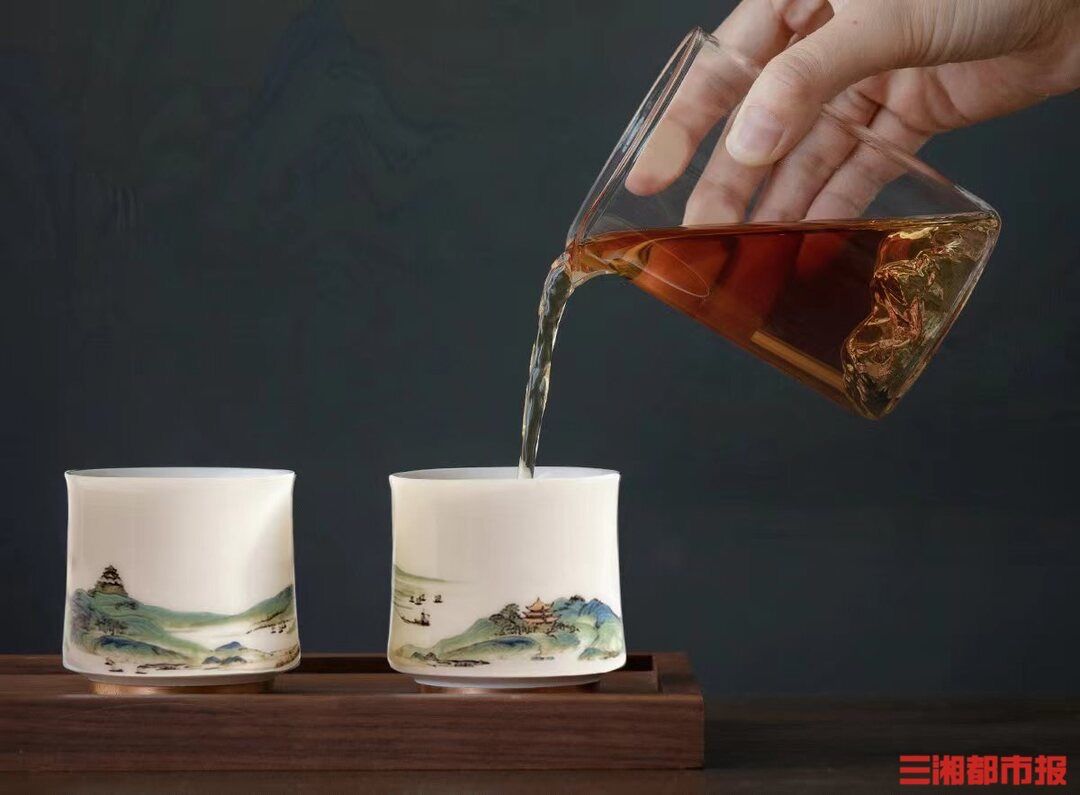 团队基于中国湖南省、日本滋贺县结缘的胜景——洞庭湖、琵琶湖以及两湖畔屹立的岳阳楼与彦根城展开设计,在晶莹剔透的白瓷双盏杯上呈现出两省县自然、人文的代表性元素。“湘瓷茗杯”高6厘米,直径6.5厘米,以白瓷为载体,釉下五彩为表现形式,采用德国进口金水、手工描绘,经1330度以上高温烧制,其胎骨细柔坚致,温润如玉,剔透光滑,器体在光线照耀下,可映见指影,叩之其音清悦悠扬,犹如敲击金属,铿然作响。作品体现了“文明互鉴、创新融合、合作共赢”的主题理念,象征美美与共,和而不同。