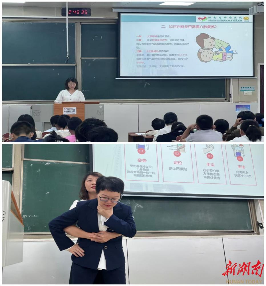 湖南省肿瘤医院ICU护士长谷梅向同学们介绍了急救知识,并亲自演绎急救的操作。心肺复苏,是当心脏骤停时,重启生命引擎的黄金钥匙。海姆立克急救法,是食物卡喉时的救命稻草,简单而有效。防溺水教育,则是夏日水域边的安全灯塔,提醒我们在水中嬉戏时,不忘安全的重要性。通过急救公益宣讲,我们希望将这些生命的守护知识,植入每个学子的心中,让急救的智慧,成为我们共同的语言,共同构筑一道守护生命的防线。