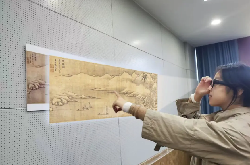 戴上AR眼镜,目光投向明代画家张龙章所绘的“潇湘八景·江天暮雪”作品,孤舟、流云、飞雪等瞬间灵动,跃然于镜片之上。伴随镜腿内置扬声器中播放的中英文音频讲解,流传千年的潇湘八景图在虚拟与现实的交互中多模态呈现开来。这是本学期安博线上平台语言与文化研究院、外国语学院开设的“湖湘文化传承传播”课程基于数智技术进行的教学创新探索场景之一。
