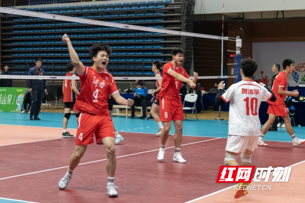 湖南男排球员挥拳庆祝得分。
