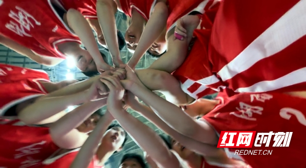 湖南女篮围成一圈加油打气。