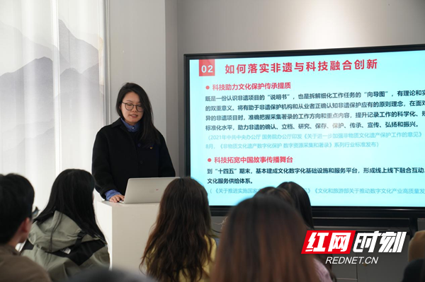 党员同志们来到位于桃子湖的“非遗+科技”创新研发中心,首先听了一堂“科技赋能非遗,增进文化自信”的微党课。艺术设计系教工党支部王玥老师带领同学们就“推进文化与科技深度融合”这一命题,分享了自己的认识与体会。王玥说,科技赋能非遗传承及创新发展,呈现勃勃生机及光明前景。王玥介绍了非遗与科技融合创新的实践路径,指出科技助力文化保护传承提质、拓宽中国故事传播舞台、塑造文化多元业态以及促进产业转型升级等方面大有可为。王玥鼓励党员同志要积极投身文化科技融合创新实践,为实现中华民族伟大复兴的中国梦贡献力量。