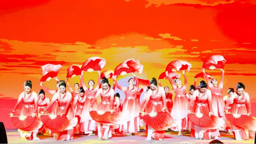由湖南师大女教授、女干部代表带来舞蹈《东方红的故事》,舞扇轻扬,不仅舞出内心情怀,更舞出未来的欣荣憧憬。