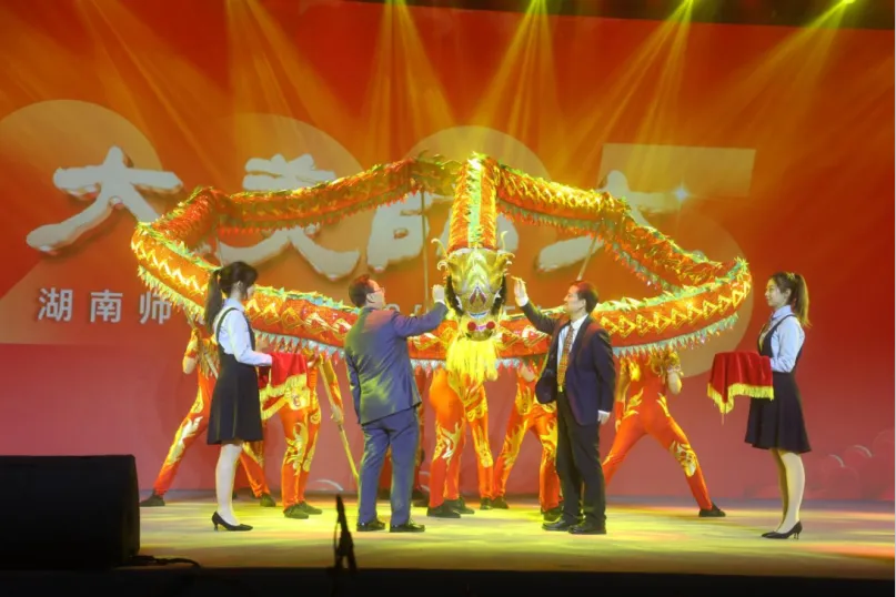 ▲湖南师大党委书记蒋洪新、校长刘仲华为舞龙点睛