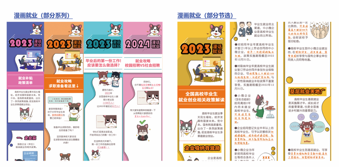 定制就业创业漫画,将最新政策日常推。从2018年开始,我们尝试运用学生喜闻乐见的形式打造了“创小漫”系列漫画,包括解读就业创业政策的“漫绘就业”、绘制人物故事的“漫绘案例”、融入思政元素的“画说党史”、抚慰学生的“治愈漫画”以及激励准教师的“师德100句”。现已绘制80余篇漫画,还衍生出配套小视频,形成了IP形象,让学生看着漫画就能了解相关政策。