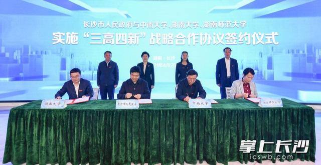 (记者 蔡颂 马铁泉)4月20日上午,我校与长沙市政府签署实施“三高四新”战略框架合作协议,开启校地合作新篇章。同时签约的还有中南大学、湖南大学。湖南省委常委、长沙市委书记吴桂英,市领导钟钢、邱继兴出席,我校党委书记蒋洪新、校长刘起军、副校长谢资清参加相关活动。