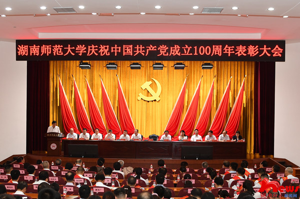 蒋洪新发表了热情洋溢的讲话,代表学校党委向获得“光荣在党50年”纪念章的老党员致以崇高敬意,向受到表彰的优秀个人和先进集体表示热烈祝贺,向全校共产党员致以节日的问候。蒋洪新深情回顾了党的百年奋斗历史,也总结了近年来学校党建工作和各项事业发展取得的突出成绩。他指出,学校改革发展所取得的辉煌成就,得益于党的坚强领导,得益于全校师生党员的率先垂范,得益于一代又一代湖南师大人的团结拼搏。蒋洪新强调,要切实加强党对学校的全面领导,牢牢把握好社会主义的办学方向,坚守立德树人初心、牢记“为党育人、为国育才”使命,着力培养德智体美劳全面发展的社会主义建设者和接班人;要以党史学习教育为契机,不断提升管党治党办学治校的能力水平,从党的辉煌历史中汲取营养,凝聚推动各项事业发展的强大合力;要进一步夯实基层基础,不断提升基层党组织的战斗力和凝聚力。蒋洪新号召全体党员,紧紧团结在以习近平同志为核心的党中央周围,大力传承和弘扬党的光荣传统和优良作风,充分发扬百年大党自强不息的奋斗精神,不忘初心、牢记使命,努力开创“五个师大”建设新篇章,为建设现代化强国和现代化新湖南作出新的更大的贡献。