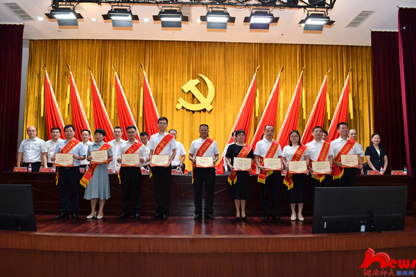 校纪委书记姚春梅宣读2019年以来学校省级以上党建荣誉获得者名单。全国先进基层党组织教育科学学院党委,湖南省优秀共产党员肖北庚,以及一批入选省级“对标争先”建设计划的集体和个人等受到表彰。