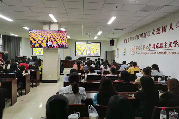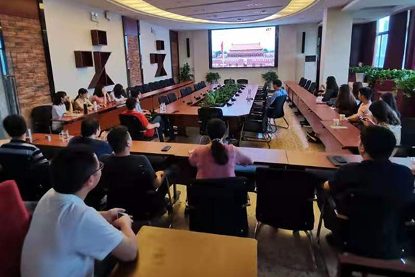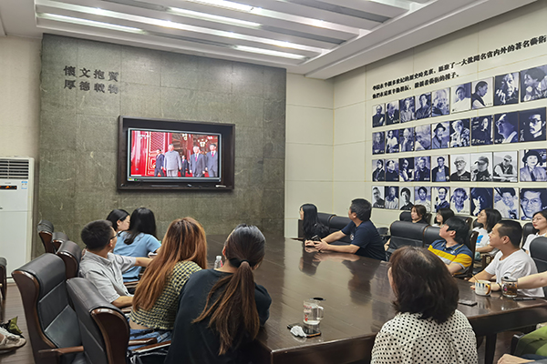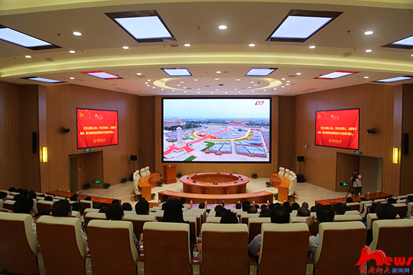 全体在家校领导和党群部门负责人在图书馆一楼报告厅组织收看庆祝大会