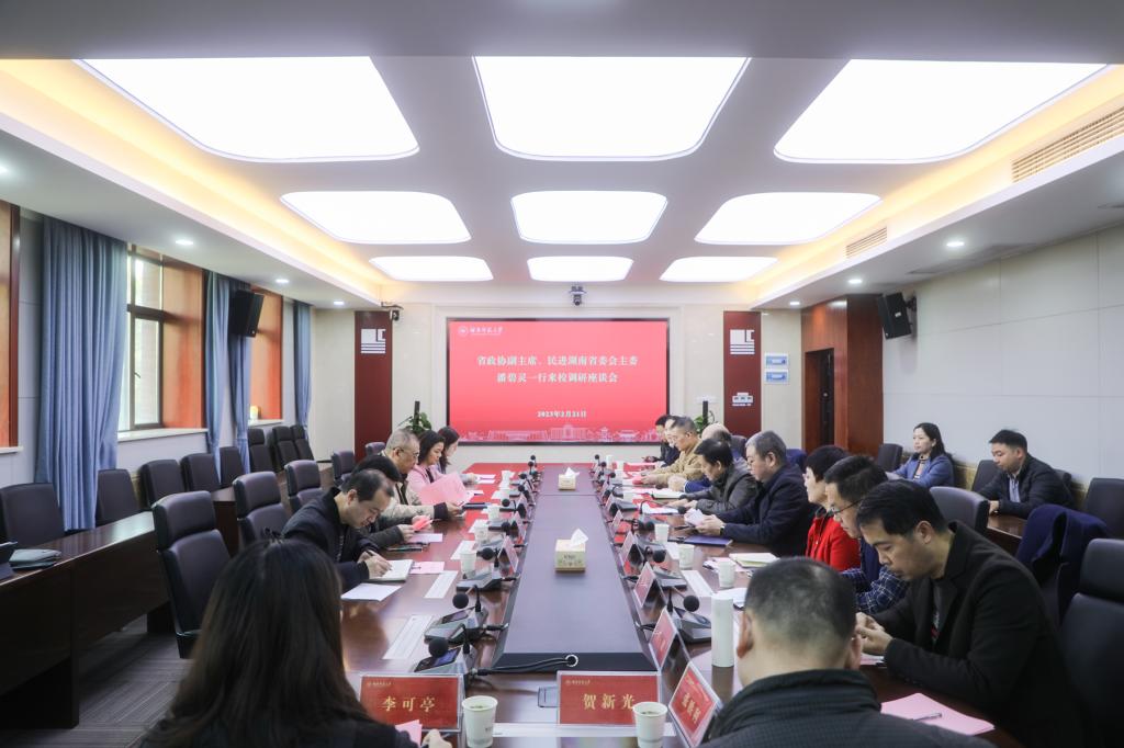 (通讯员 周铁杨 记者 马铁泉 冯振辉)2月21日上午,全国政协常委、民进中央常委、省政协副主席、民进湖南省委会主委、省生态环境厅副厅长潘碧灵一行来校走访调研。校党委书记蒋洪新在中和楼六楼会议室主持召开调研座谈会。民进湖南省委会秘书长赵品山、我校党委副书记周俊武出席座谈会。