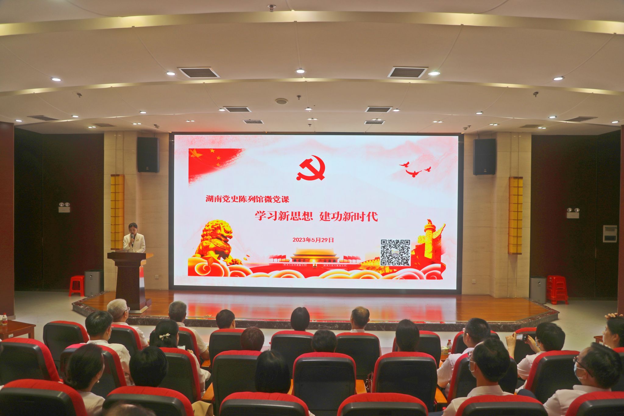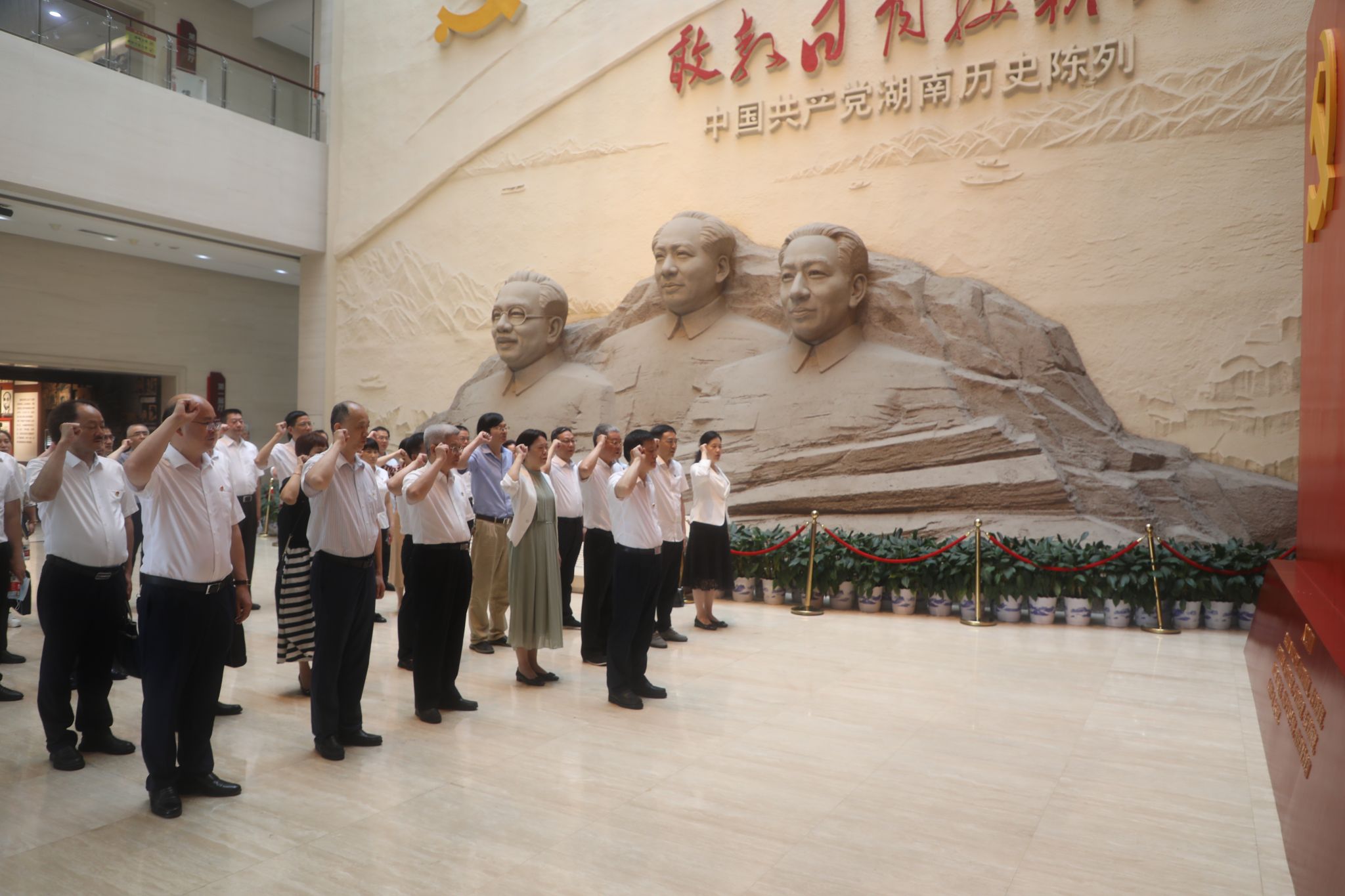在陈列馆大厅,蒋洪新带领大家重温入党誓词;并依次参观了“开辟新天地-新民主主义革命时期”“描绘新画卷-全面建设社会主义时期”“谱写新篇章-改革开放时期”“奋进新时代-中国特色社会主义新时代”四个党史篇章以及“三湘群英谱”湖南党史人物专题展厅。一幅幅生动的历史画卷、一件件令人震撼的实物、一个个激动人心的战斗故事,生动展示了新民主主义革命、全面建设社会主义、改革开放及中国特色社会主义新时代等时期三湘儿女在党领导下的奋斗历程、辉煌成就和宝贵经验。