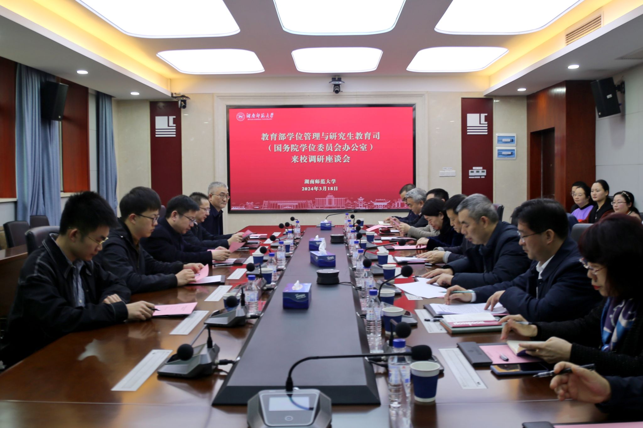 教育部学位管理与研究生教育司学位管理处干部陈傲寒、张万龙,湖南省教育厅学位管理与研究生教育处处长颜胜利,学校相关职能部门及二级学院负责人陪同调研并参加座谈会。