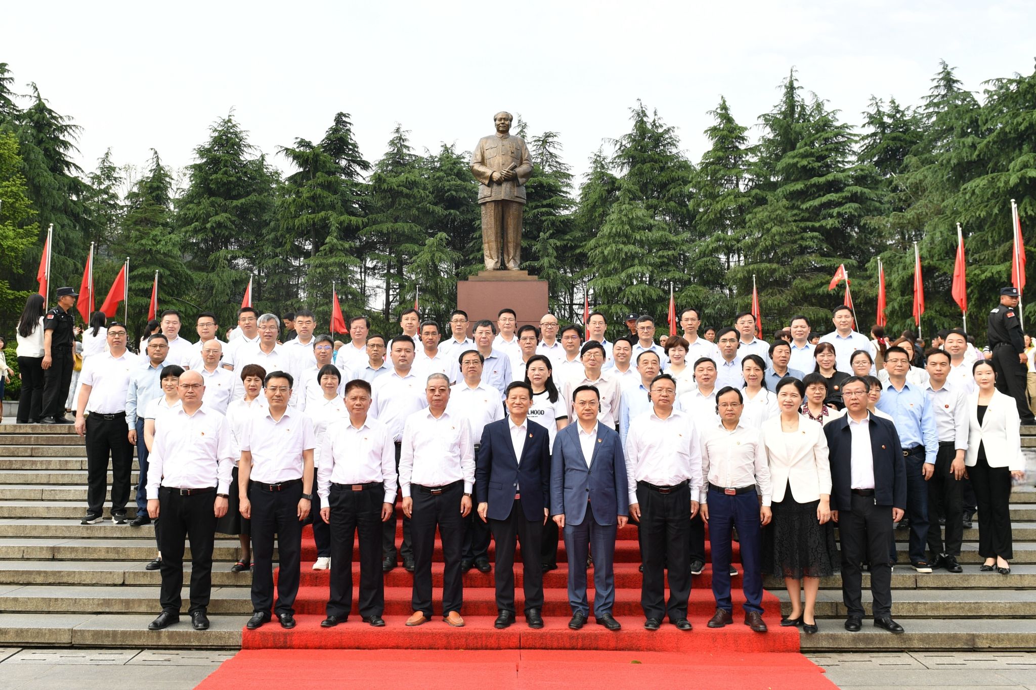 在毛泽东主席铜像广场,全体人员整齐列队,向毛泽东主席铜像敬献花篮并重温入党誓词。