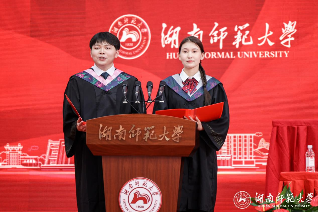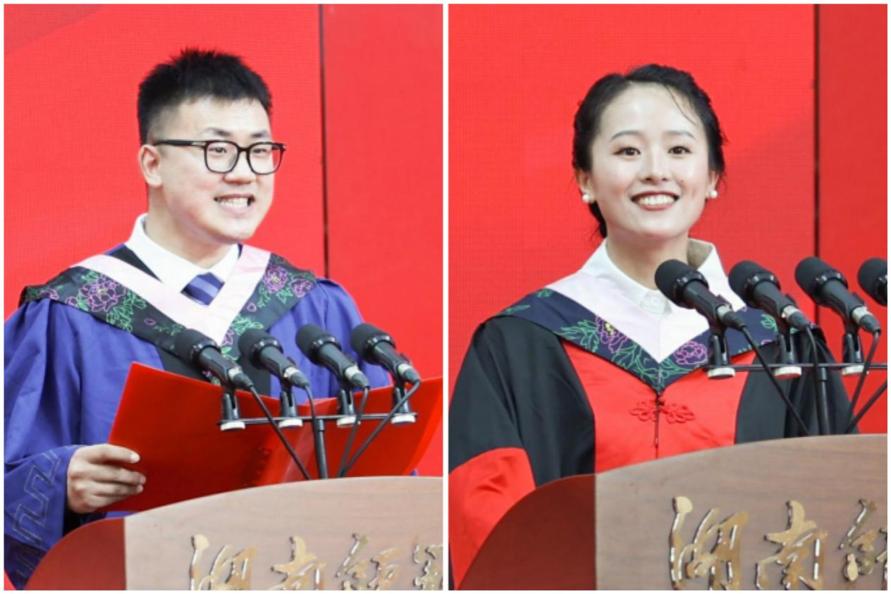 工程与设计学院硕士毕业生肖鑫宇、外国语学院博士毕业生刘欣婷作为毕业生代表发言。他们回忆了自己在校求学和成长的经历,表达了对母校、对老师的感激与不舍之情以及争做栋梁、报效祖国的决心,并勉励广大毕业生在党和人民最需要的地方建功立业、激扬青春、书写人生。